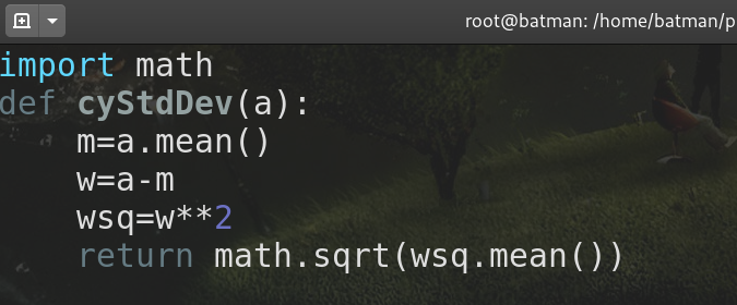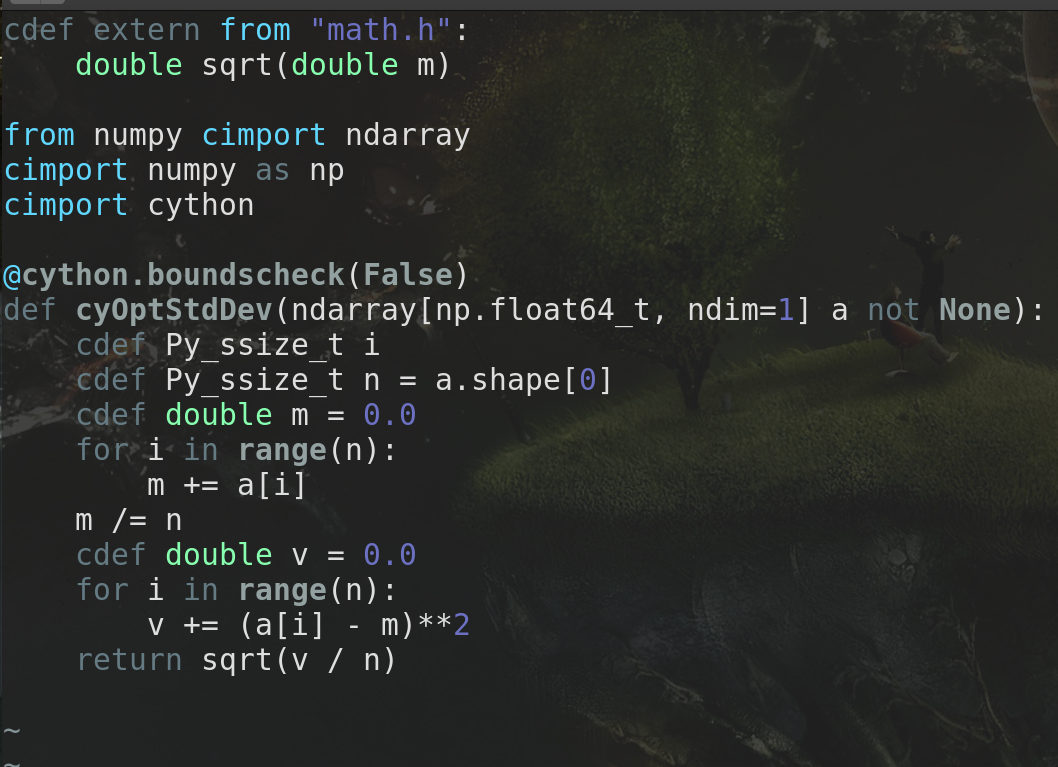 - Optimized Cython file name: cyStdDevOptimized.pyx code: