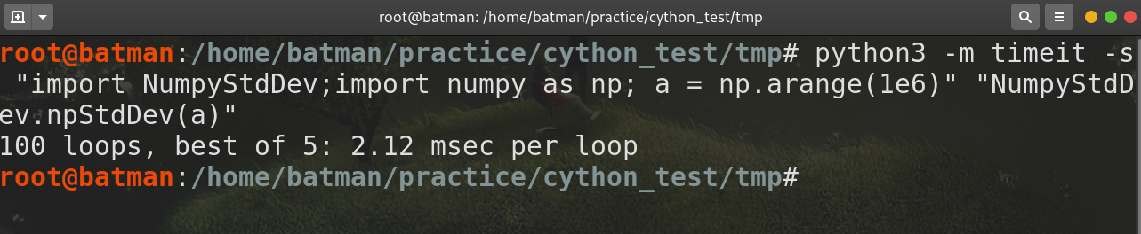 of-course numpy beat my code as it was purely written in C. However optimized Cython code is quite close to Numpy. So if you have time consuming task in your python program .. you can create a module in Cython to perform that task and import it in main code. This will help to gain performance. Also as Cython is superset of python, all python code is valid cython code. There is so much ways to use cython in python codes. Hope you learn something in this blog.