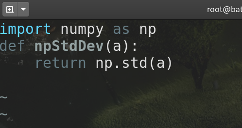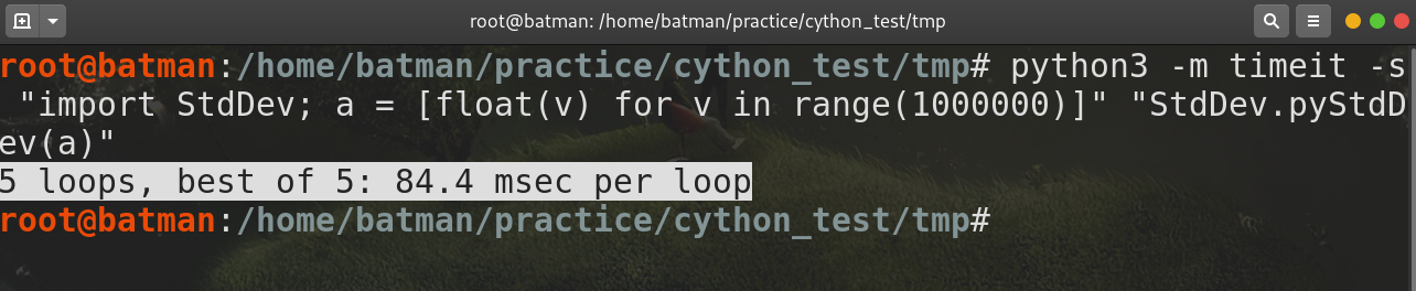 test this code with below command: python3 -m timeit -s “import StdDev; import numpy as np; a = [float(v) for v in range(1000000)]” “StdDev.pyStdDev(a)”
