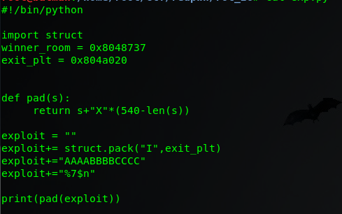 Here I have imported struct . Then i store the address of winners_room & exit_plt to use later. I also define a function pad to pad the string by some “X” to make it of length 540(enough to get the task done, however we have buffer of 4096 which quite large and unnecessary )